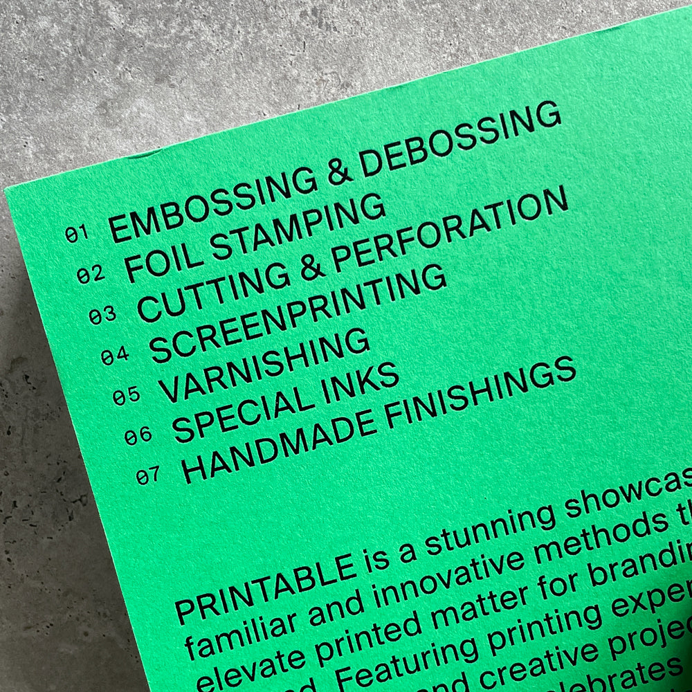 PRINTABLE is a stunning showcase of familiar and innovative methods that elevate printed matter for branding and beyond. Featuring printing experts, printmakers, and creative projects from around the world, it celebrates craftsmanship and serves to inspire those looking to add more character and dimension to their work.