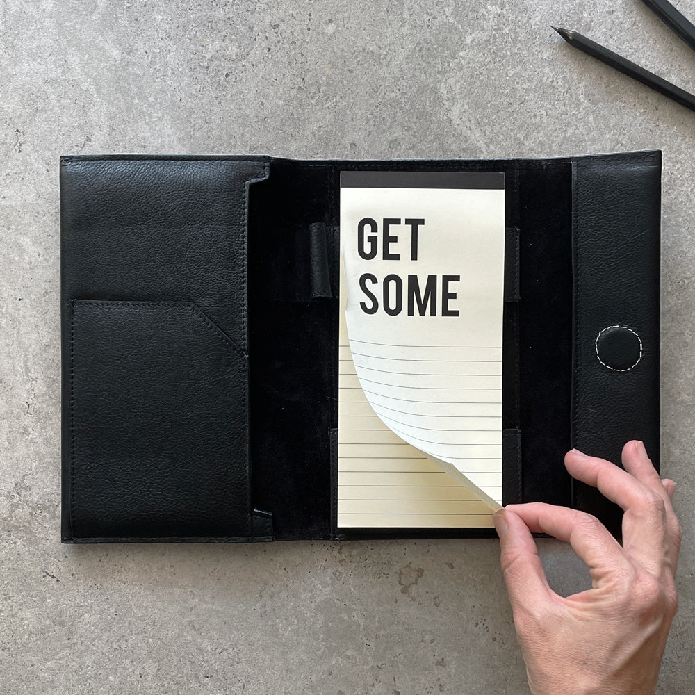 - Includes a refill Get Some Paper Block, a Black Notebook, and a Black Pen.